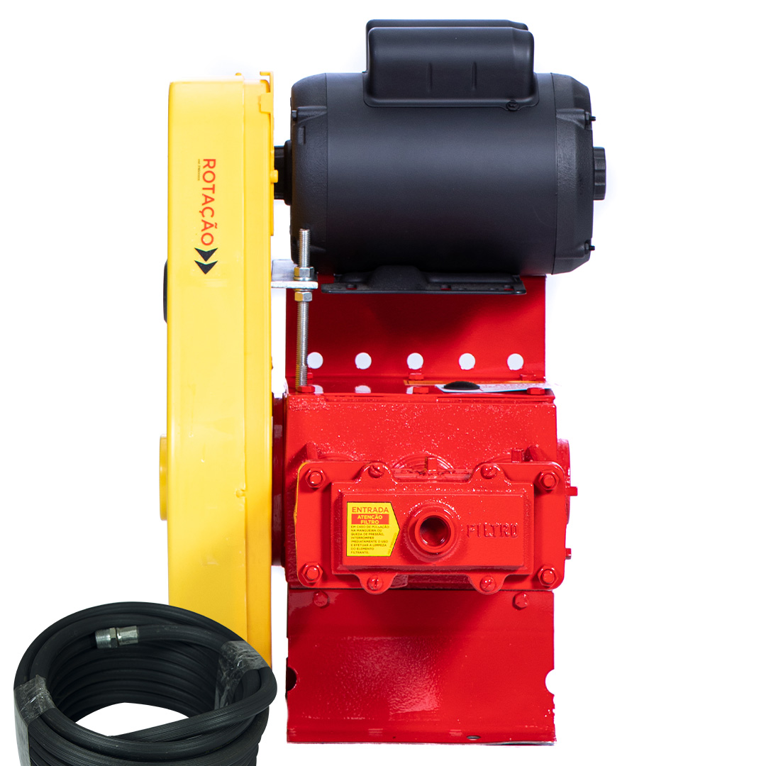 Modelo da Bomba: Hidromar BH 6100 Fixa Pressão: 440 Libras (PSI) Vazão: 26 L/min Marca do Motor: WEG Potência: 2cv (Cavalos) Tensão: 220v Trifásico (3 Fases) Rotação: Baixa Rotação (4 polos) Mangueira: Preta de 1/2 polegada com 10 metros Esguicho: Preto 3.2mm Regulável Cárter da Bomba: Fornecido sem óleo